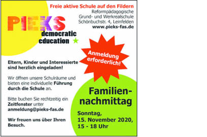 Die Freie aktive Schule auf den Fildern ist eine staatlich genehmigte Grund- und Hauptschule mit Werkrealschule für Schülerinnen und Schüler in den Jahrgangsstufen 1-10. Die Schülerinnen und Schüler entscheiden frei und selbstbestimmt, was, wann, wie, wo und mit wem sie lernen wollen, wie ihre Lerninhalte und die Lernumgebung gestaltet sein sollen und nach welchen Regeln die Schulgemeinschaft zusammen lebt und arbeite